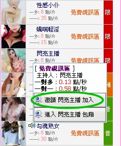 5.在你喜歡的主持人框中按滑鼠左鍵,選擇《 邀請 xxx主播 加入 》,觀看主持人免費視訊及聊天